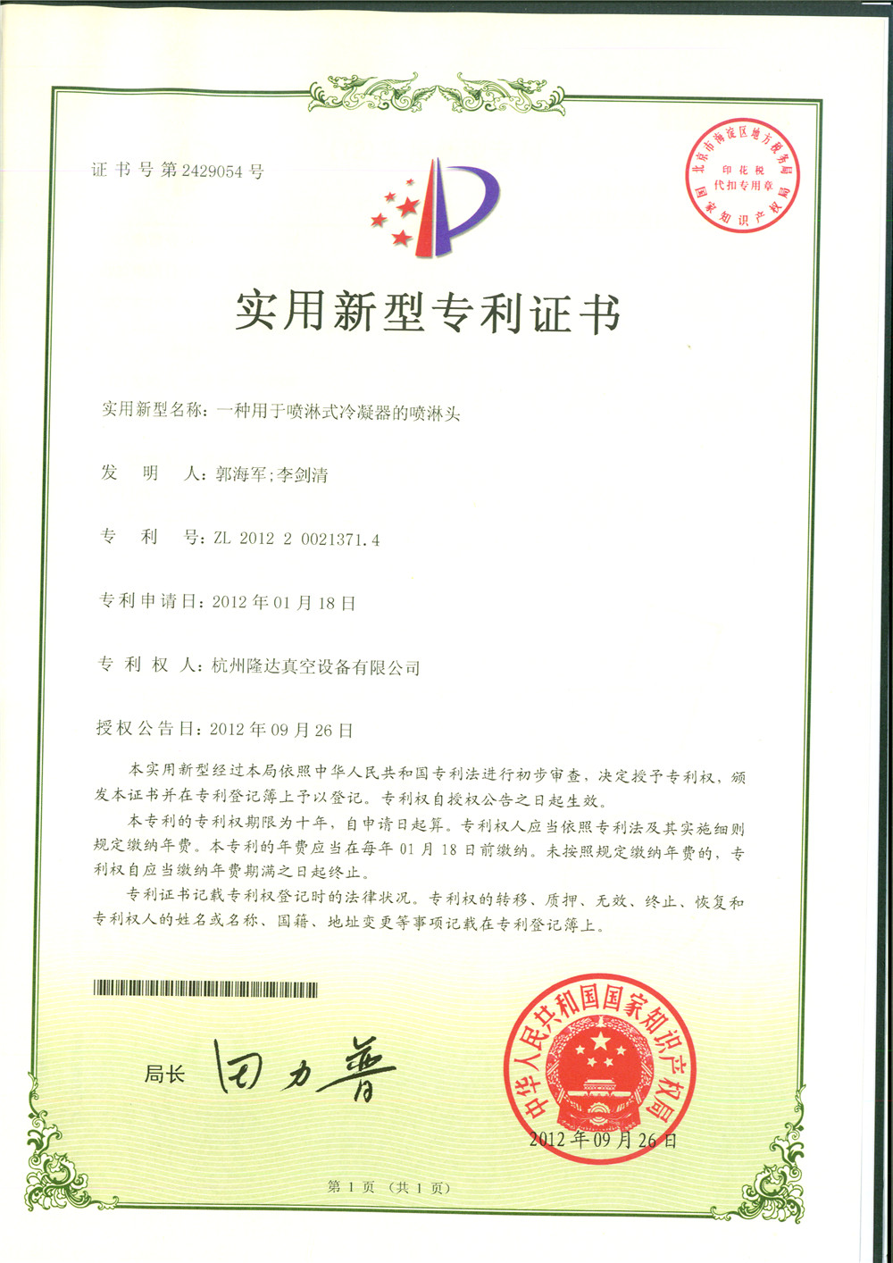一種用于噴淋式冷凝器的噴淋頭專利證書